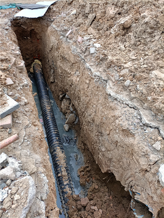 居住在維也納小區(qū)的幾位居民分析說,維也納大門前邊的污水有可能是對面施工堵塞下水道后造成污水溢出造成的。記者又來到維也納小區(qū)對面的馨蓮茗苑小區(qū)門前,那里路面沒有積水,正在進(jìn)行的市政工程施工工地也沒有看到有大量污水流淌,在馨蓮茗苑大門東邊不遠(yuǎn)處有一條挖開的管道溝槽,溝槽的底部有少量污水。剛下班的一名工人師傅說,現(xiàn)在他們正在修建新的下水道,管道建好還得一段時(shí)間,舊的排水管道還在使用,至于路南邊的污水與正在施工的工程有沒有聯(lián)系,他們也說不清楚。