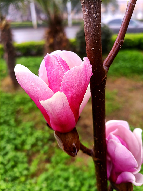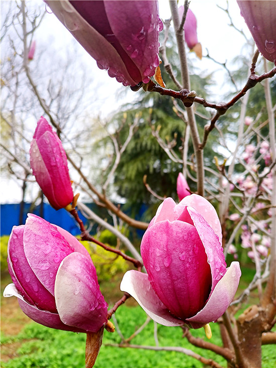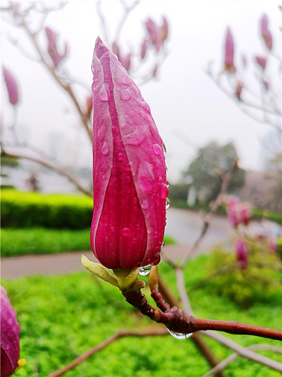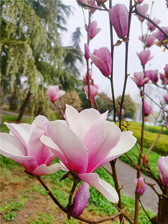 “霓裳片片晚妝新,束素亭亭玉殿春。已向丹霞生淺暈,故將清露作芳?jí)m?!?月11日,我市下了一場小雨,路旁的紫玉蘭更顯晶瑩玉潤,朵朵玉蘭花如雨后新荷般清麗脫俗,或含苞待放、欲語還休,或花瓣盡展、舞姿翩翩,令人不禁駐足欣賞。