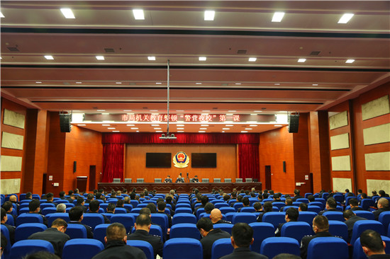 3月10日晚,“警營夜?!钡谝徽n正式開班開講。市公安局黨委委員、政治部主任郭冰與230名副科職以上民警一起參加學習。市公安局政治部黨支部副書記、三級高級警長韓鳳城主持第一課。