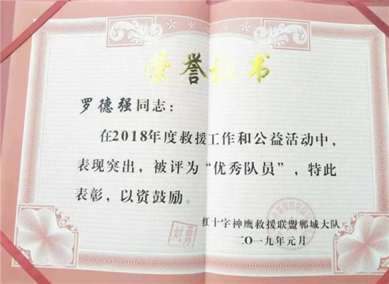 鄲城神鷹救援隊王梅說:“羅德強雖然加入時間不長,但是每次接到通知就立即趕到,任勞任怨、無怨無悔,是我們隊里公認(rèn)的好同志?!绷_德強是一名普普通通的職工,還是一名胸懷大愛的熱心市民。每個人的生命都只有一次,因為見多了生死邊緣,他更希望人們珍愛自己的生命,他是一個戰(zhàn)士,他的勇氣讓所有人敬佩,因為有這樣的人,國人的風(fēng)骨得以傳承挺立。