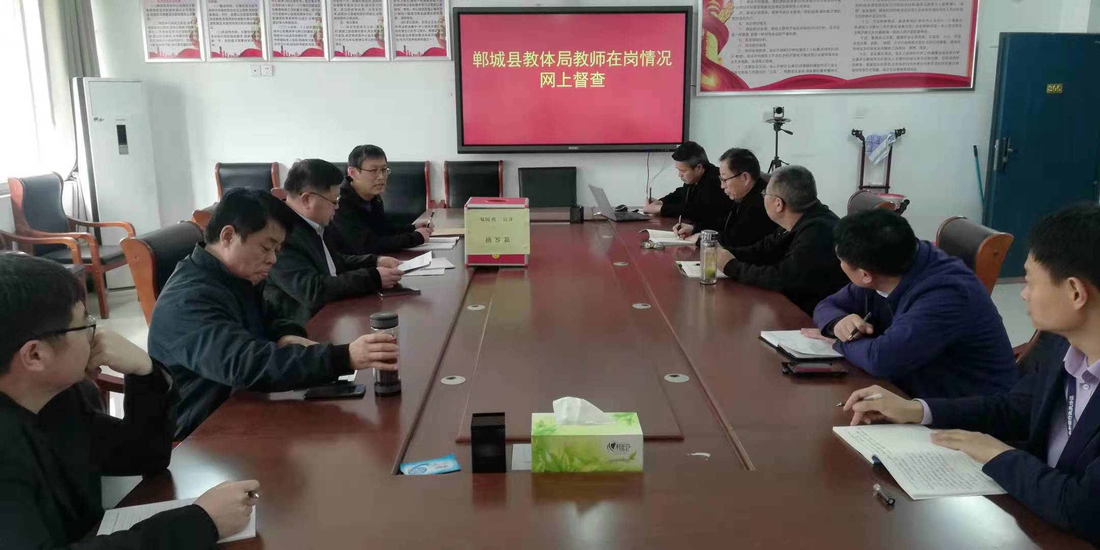 抽查時,紀檢組、督導室、辦公室、人事股、目標辦等相關股室負責人和工作人員全部到崗到位,從抽簽箱中隨機抽出三個球號組成一組數(shù)字,然后從《隨機抽查檢查對象名錄庫》中確定被督查學校。網(wǎng)上督查人員接通被督查學校負責人或者教職工“企業(yè)微信”,通過視頻形式督查教師在崗信息公示情況、教師到崗情況、平時學校(中心校)對教師管理教育情況等,并同步與人事(師訓)教職工(特崗教師)信息系統(tǒng)比對。出差、請假等須當場提供相關佐證材料。對疑似存在問題的,紀檢、人事部門當即啟動線下復核程序。