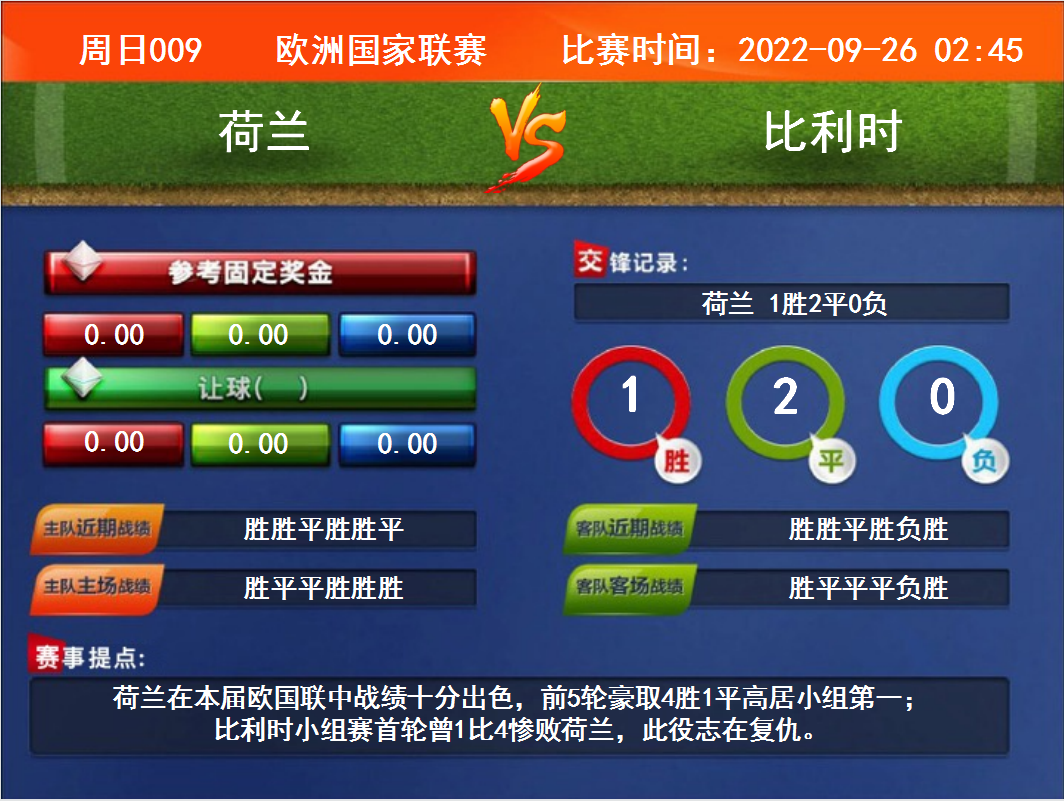 比賽時(shí)間:2022-09-26 02:45賽事提點(diǎn):荷蘭在本屆歐國(guó)聯(lián)中戰(zhàn)績(jī)十分出色,前5輪豪取4勝1平高居小組第一;比利時(shí)小組賽首輪曾1比4慘敗荷蘭,此役志在復(fù)仇。
