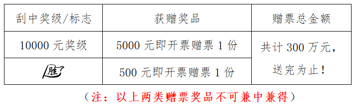 活動期間,購彩者在河南省范圍內任一體彩銷售實體店購買指定活動票種,若單張彩票刮中符合獎勵條件的獎級或標志,經實體店終端兌獎設備成功完成獎金兌付及促銷兌獎掃描后,即可獲得即開票贈票獎品一份。總額有限,送完為止,詳見下表: