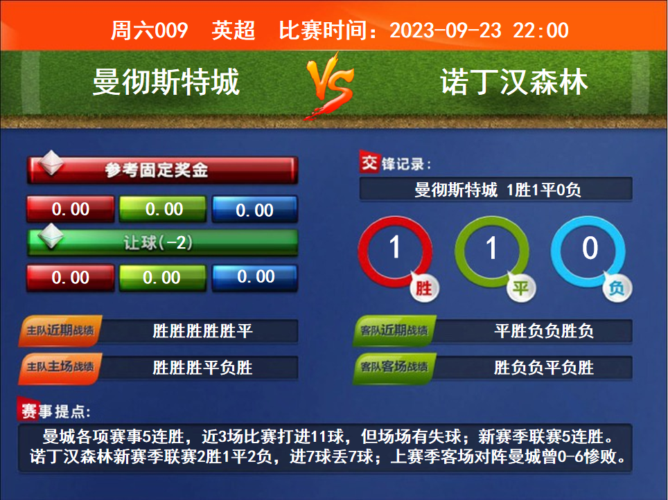 比賽時間:2023-09-23 22:00賽事提點(diǎn):曼城各項(xiàng)賽事5連勝,近3場比賽打進(jìn)11球,但場場有失球;新賽季聯(lián)賽5連勝。諾丁漢森林新賽季聯(lián)賽2勝1平2負(fù),進(jìn)7球丟7球;上賽季客場對陣曼城曾0-6慘敗。