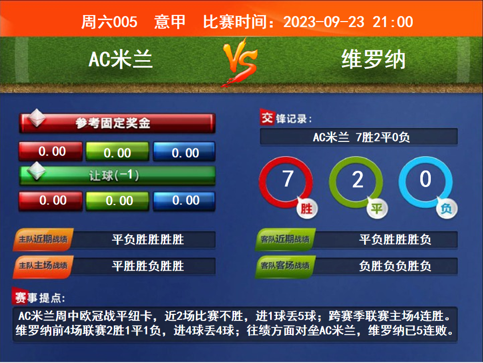 比賽時間:2023-09-23 21:00賽事提點(diǎn):AC米蘭周中歐冠戰(zhàn)平紐卡,近2場比賽不勝,進(jìn)1球丟5球;跨賽季聯(lián)賽主場4連勝。維羅納前4場聯(lián)賽2勝1平1負(fù),進(jìn)4球丟4球;往績方面對壘AC米蘭,維羅納已5連敗。