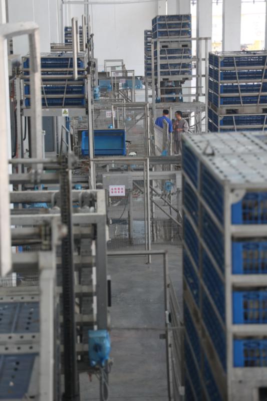 宰雞第一步先消毒,一筐筐自動(dòng)分好的白羽活雞上架后即得到?jīng)_洗,“干干凈凈”地進(jìn)入下一程序——掛雞。步驟與步驟銜接中的自動(dòng)化程度很高,掛雞室光線略暗?!拔覀儾捎脟?guó)際化標(biāo)準(zhǔn),宰殺環(huán)節(jié)在暗室進(jìn)行?!毕嚓P(guān)人員說(shuō)。