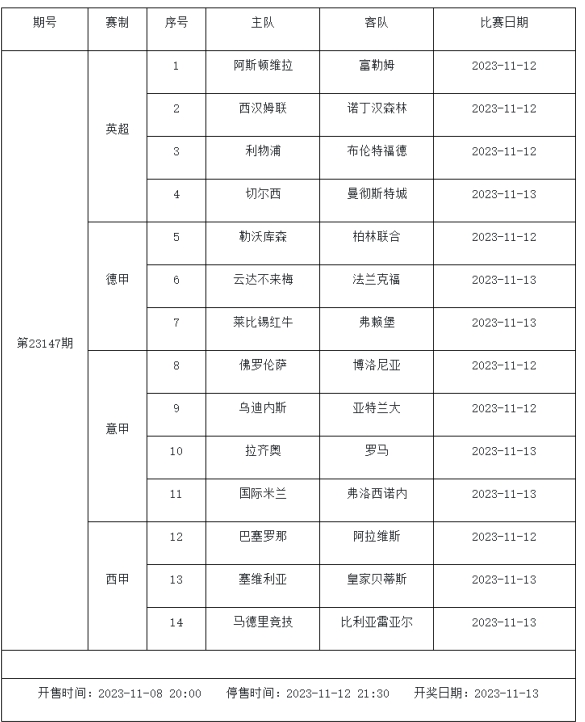 足球彩票勝負游戲(14場和任選9場)第23147期賽程: