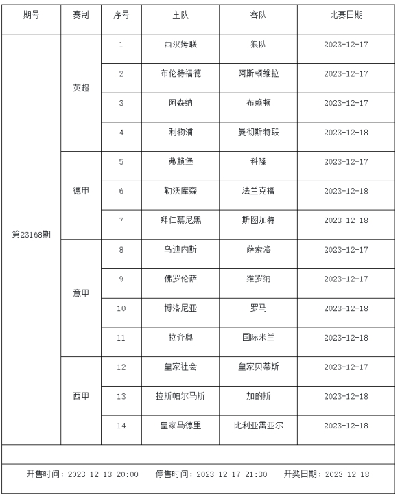 足球彩票勝負(fù)游戲(14場(chǎng)和任選9場(chǎng))第23168期: