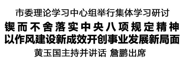 本報訊(記者 王艷) 1月16日,市委理論學(xué)習(xí)中心組舉行集體學(xué)習(xí)研討,深入學(xué)習(xí)貫徹習(xí)近平新時代中國特色社會主義思想,全面貫徹落實黨的二十屆四中全會精神,以打攻堅戰(zhàn)、持久戰(zhàn)的決心和恒心,鍥而不舍落實中央八項規(guī)定精神,推進作風(fēng)建設(shè)常態(tài)化長效化,以優(yōu)良作風(fēng)凝心聚力、真抓實干,為開好民主生活會打牢思想基礎(chǔ)。市委書記黃玉國主持并講話。市長詹鵬出席。