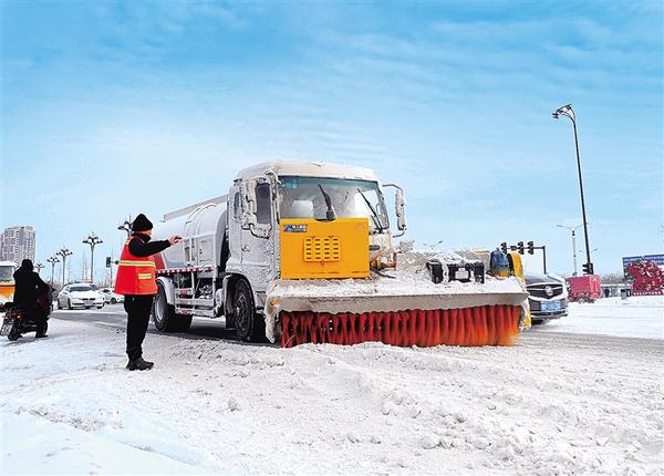 1月19日,環(huán)衛(wèi)工在關(guān)帝廟廣場(chǎng)清掃積雪,保障道路暢通。