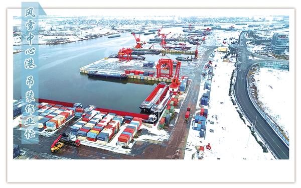 1月21日上午,白雪裝點(diǎn)下的周口中心港范營作業(yè)區(qū)一片繁忙景象。碼頭上,運(yùn)輸車輛往來穿梭,集裝箱吊裝作業(yè)有序進(jìn)行,呈現(xiàn)了新年伊始港口生產(chǎn)的蓬勃?dú)庀蟆?/p>