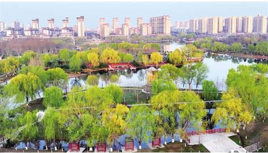 春分時節(jié),扶溝縣人民公園春光如畫,柳絲輕拂碧水,廊道婉轉曲折,滿目詩情畫意。