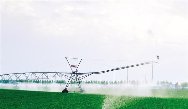 近日,在河南周口國家農(nóng)高區(qū)鄲城縣高標(biāo)準(zhǔn)農(nóng)田示范區(qū),平移式噴灌機(jī)伸展銀色“臂膀”,將精準(zhǔn)調(diào)配的水肥溶液均勻?yàn)⑾蚓G油油的麥田。