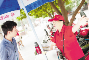 8月28日,55歲的志愿者徐麗華(右)在四川成都人民南路二段與濱江路交叉口的志愿者服務(wù)站為人指路。 炎炎夏日,許多志愿者活躍在四川成都的街頭巷尾,他們耐著高溫濕熱的天氣,為市民游客答疑解惑、提供力所能及的幫助。這些志愿者成了蓉城夏日街頭的一道靚麗風(fēng)景。 新華社發(fā)