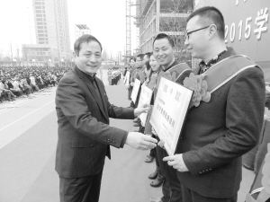 3月8日上午,淮陽一高萬余名師生在學(xué)校操場(chǎng)隆重舉行新學(xué)期表彰大會(huì)。大會(huì)回顧了2014~2015學(xué)年第一學(xué)期的各項(xiàng)工作,對(duì)感動(dòng)校園學(xué)生、優(yōu)秀班主任、優(yōu)秀員工、優(yōu)質(zhì)課教師等24個(gè)項(xiàng)目近500人次進(jìn)行了表彰?;搓柨h有關(guān)領(lǐng)導(dǎo)及淮陽一高全體師生參加了本次表彰大會(huì)。圖為王業(yè)生校長為獲獎(jiǎng)人員頒發(fā)獎(jiǎng)狀。(豆紀(jì)鋒 攝)