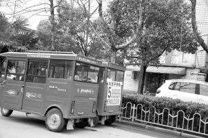 圖④ 七一路西段兩輛“紅頂”三輪車并排停放在快車道上,咱能不能換個(gè)安全的地方聊天?!