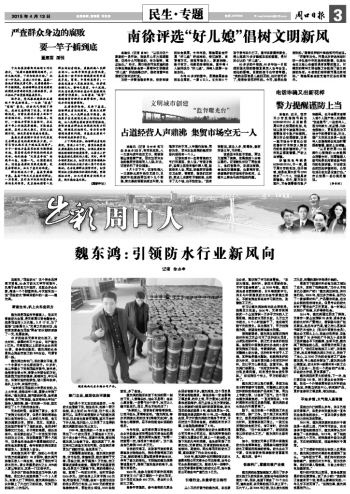 眼下,他正在做一個新型施工體系的示范、推廣工作。這個施工體系簡而言之,就是用新型的非固化膠體粘合防水材料,直接鋪在施工面上,一改過去用噴槍粘合的方式,省工省時,防水效果更佳。“這個體系做好了,將徹底改變以往的防水工藝。”魏東鴻對此極有信心。