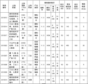 備注:1.2013013、2013014、2013017、2013022、2013037、2013038、2013039宗地位于產(chǎn)業(yè)集聚區(qū)內(nèi),屬兩層以上標(biāo)準(zhǔn)化廠房建設(shè)用地,投資強(qiáng)度≥3750萬元/公頃。地上有部分違法建筑物,經(jīng)政府辦、發(fā)改委、財(cái)政局、監(jiān)察局、法制辦、住建局、審計(jì)局、房產(chǎn)辦、規(guī)劃辦、城市綜合執(zhí)法局和縣產(chǎn)業(yè)集聚區(qū)管委會集體研究,地上建筑不再作價(jià)與土地捆綁出讓,由土地競得人無償處置地上建筑物。土地出讓合同簽訂后,8個(gè)月內(nèi)必須開工建設(shè),工期24個(gè)月,土地成交價(jià)款需在土地出讓合同簽訂后60日內(nèi)繳清,交地時(shí)間在3個(gè)月內(nèi)。