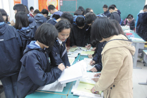 該校將課堂名字定為“求真大課堂”,以“真”字作為學(xué)校一切教育教學(xué)和管理的衡量標(biāo)準(zhǔn)。朱貴華說(shuō),求真就是要真教、真學(xué)、真嚴(yán)、真愛(ài)、真實(shí)、真會(huì)。為提高課堂教學(xué)效果,該??偨Y(jié)出一套獨(dú)特的課堂教學(xué)方法——“七音和鳴”。分管教學(xué)工作的副校長(zhǎng)徐其運(yùn)用“1234567”,即哆來(lái)咪發(fā)唆拉西”來(lái)詮釋“七音和鳴”法。“1”就是一個(gè)學(xué)習(xí)目標(biāo);“2”就是提前兩分鐘進(jìn)班,布置2個(gè)任務(wù)(出示目標(biāo)、檢查學(xué)情);“3”就是準(zhǔn)備3個(gè)本子,即學(xué)情檢效本、跟蹤本、糾錯(cuò)本;“4”是4個(gè)維度考評(píng),即高速度、準(zhǔn)確度、干凈度、參與度;“5”是5個(gè)跟蹤,即節(jié)跟蹤、日跟蹤、周跟蹤、月跟蹤、學(xué)期跟蹤,堅(jiān)持“抓緊跟蹤不放松、我在文昌必成功”的教育信念;“6”是6個(gè)環(huán)節(jié),即激情導(dǎo)入、自研自探、合作探究、展示質(zhì)疑、師生點(diǎn)評(píng)、當(dāng)堂檢測(cè);“7”是7個(gè)評(píng)價(jià),即教師的教案、學(xué)生的學(xué)案、練案、觀課記錄的每周業(yè)務(wù)評(píng)價(jià)及對(duì)學(xué)生的即時(shí)性、激勵(lì)性、長(zhǎng)效性評(píng)價(jià)。