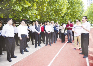 參加河南省推進(jìn)老年人體育工作現(xiàn)場會的與會人員在市領(lǐng)導(dǎo)徐光、劉繼標(biāo)等陪同下到星龍華緣小區(qū)參觀老年人健身場地。