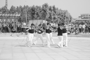 為進一步推動全民健身活動的深入開展,項城市啟動了“全民健身月”活動,讓市民積極投身到全民健身行列中,努力使體育鍛煉經(jīng)?;?、個人健身生活化。圖為5月18日項城市鞭陀協(xié)會的會員正在進行鞭陀健身展演。