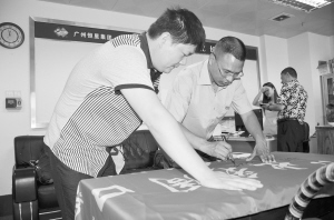 張海勇在“出彩周口人”彩旗上簽字.