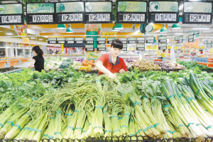 6月9日,一名工作人員正在市區(qū)一超市內擺放蔬菜。當日,國家統(tǒng)計局發(fā)布的數(shù)據(jù)顯示,2015年5月,全國居民消費價格總水平同比上漲1.2%。(牟宇 攝)