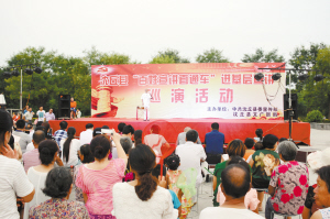 7月13日,沈丘縣“百姓宣講直通車”進基層宣講首場演出在該縣中華槐園千字文廣場舉行,舞蹈、戲曲、小品、大鼓書等多樣化的藝術形式,為前來游玩休閑的市民獻上了一道豐厚的精神大餐,讓大家在娛樂之余,對黨的新理論新政策有了更多的了解。圖為節(jié)目演出現場。(邵永成 攝)