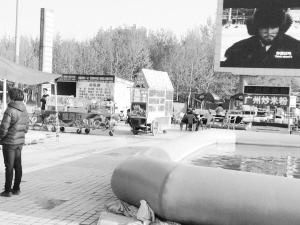 4月8日18時許,記者在現(xiàn)場看到,廣場的中央噴泉東側擺了許多攤點,有的攤點甚至把桌椅擺到了人行道上(如圖)。在廣場東側的出入口處,一些賣飯的商販已經將桌椅擺放整齊,不寬的道路被占去近一半。